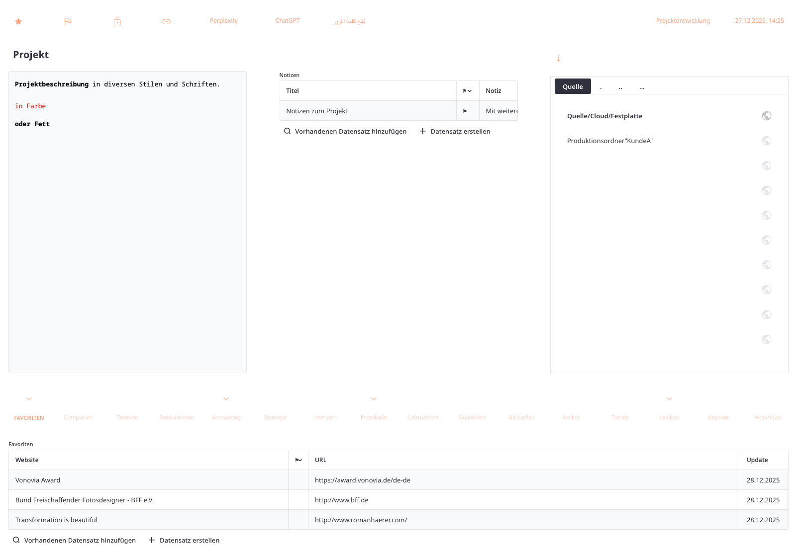 Notizen, Cloud, Infos, Bildarchiv, Links, Terminübersichten, Rechnungen, Adressen, Firmen sind sofort und ohne Streuverlust abrufbar.
